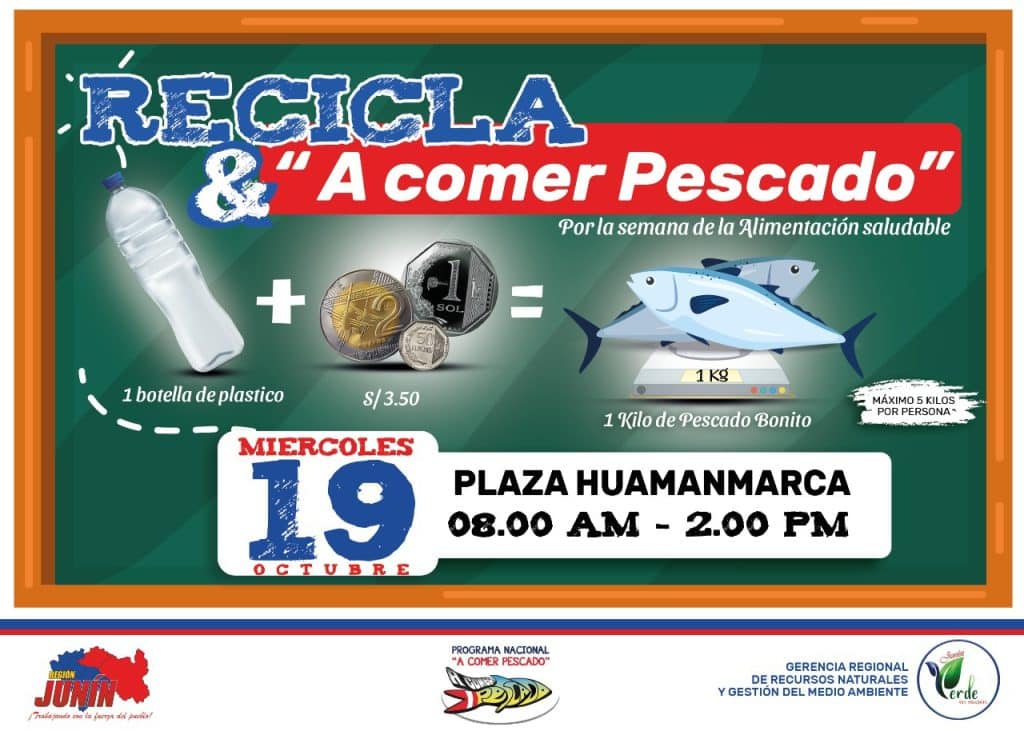 El Gobierno Regional de Junín a través de la Gerencia Regional de Recursos Naturales y Gestión del Medio Ambiente, en coordinación con el Programa nacional “A Comer Pescado” desarrollaran la actividad “RECICLA Y A COMER PESCADO”.