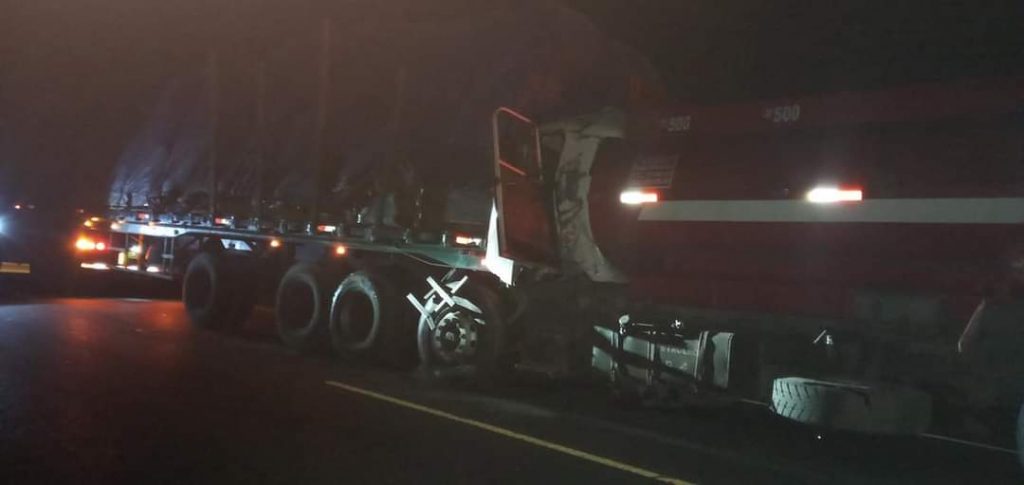 Un camion cisterna cargado de combustible, con placa F2F-740 color rojo y blanco choco contra un semitrailer de placa F3J-875, que se encontraba estacionado por desperfectos mecanicos.
