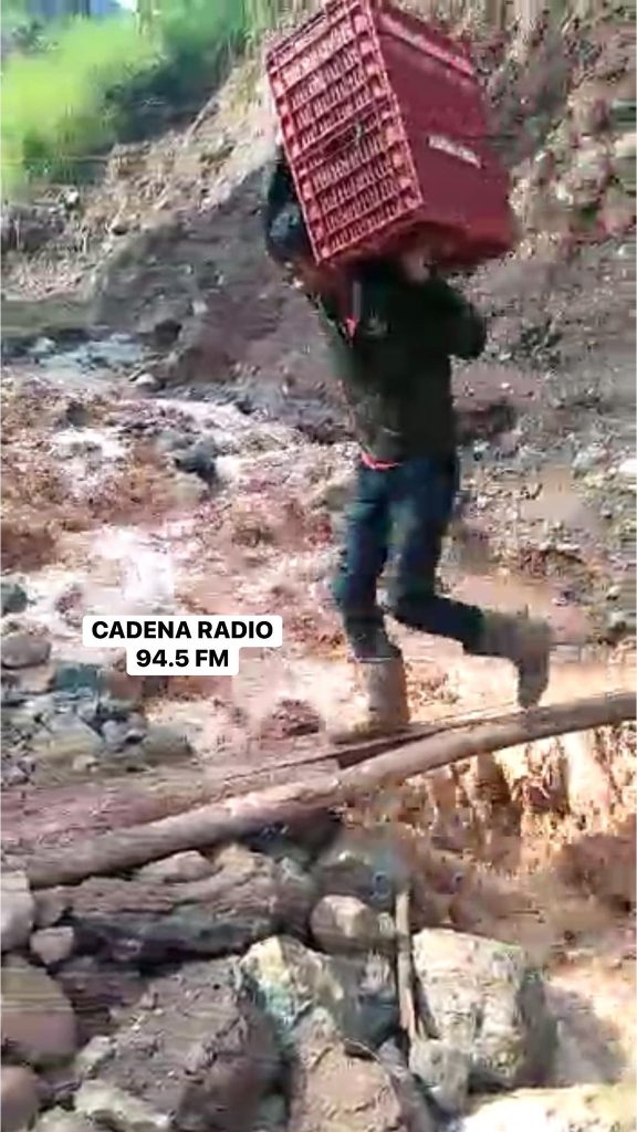Para evitar que sus productos se malogren, agricultores del centro poblado de Rondayacu en el distrito de Monobamba en Jauja, arriesgan sus vidas cruzando un peligroso tramo de la carretera que fue arrasado por un huaico.