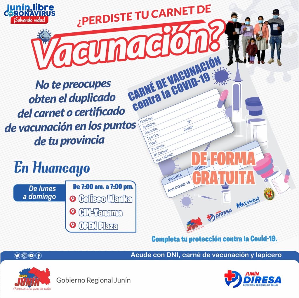 El proceso de vacunación contra la Covid-19 en la región Junín, continúa desarrollándose, como componente principal del plan regional “Junín Libre de Coronavirus”, a la fecha 913 mil 883 personas ya recibieron su primera dosis, 788 mil 675 la segunda y 61 mil 265 la tercera. A partir del 10 de diciembre el ingreso a establecimientos públicos y privados será presentando la tarjeta o certificado de vacunación, que acredita la inoculación de las dos dosis. En ese sentido el Gobierno Regional de Junín, a través del sector salud, entregará duplicados de carnet de vacunación contra la COVID 19, en los puntos fijos a nivel regional.