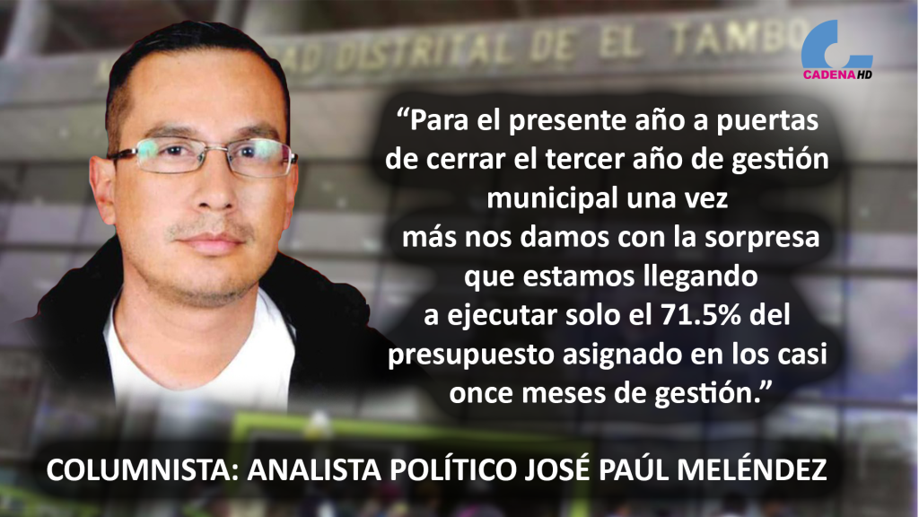 A un poco más de treinta días para cerrar el año 2021 y por ende el tercer año de gestión municipal, es necesario conocer cuál es el avance presupuestal de la gestión municipal del distrito de El Tambo, distrito más poblado de nuestra región y con muchas carencias que a la fecha su alcalde no ha sabido solucionar, por falta de voluntad política, por desidia o simplemente por incapacidad.