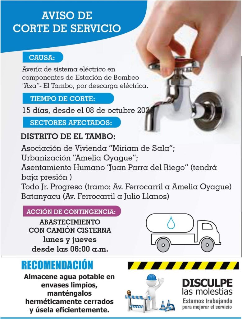 se pide las disculpas del caso por esta situación fortuita y se recomienda a la población almacenar el agua potable en envases limpios, mantenerlos herméticamente cerrados y usarlos eficientemente.