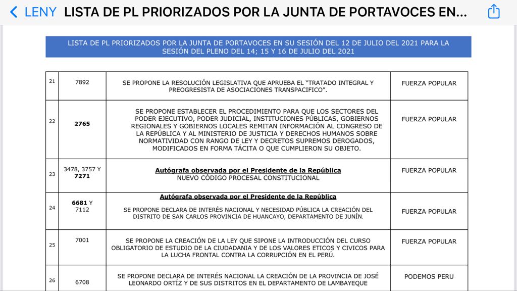 Agendó para que el Pleno del Congreso a realizarse hoy, mañana jueves 15 y viernes 16 del presente mes se DEBATA y APRUEBE POR INSISTENCIA la Ley de CREACIÓN DEL DISTRITO DE SAN CARLOS, después de haber sido observado el 23 de junio por el Presidente de la República Francisco Sagástegui según el oficio No 378-2021 PR dirigido a la Presidenta del Congreso Mirtha VÁSQUEZ CHUQUILÍN el 23 de junio.