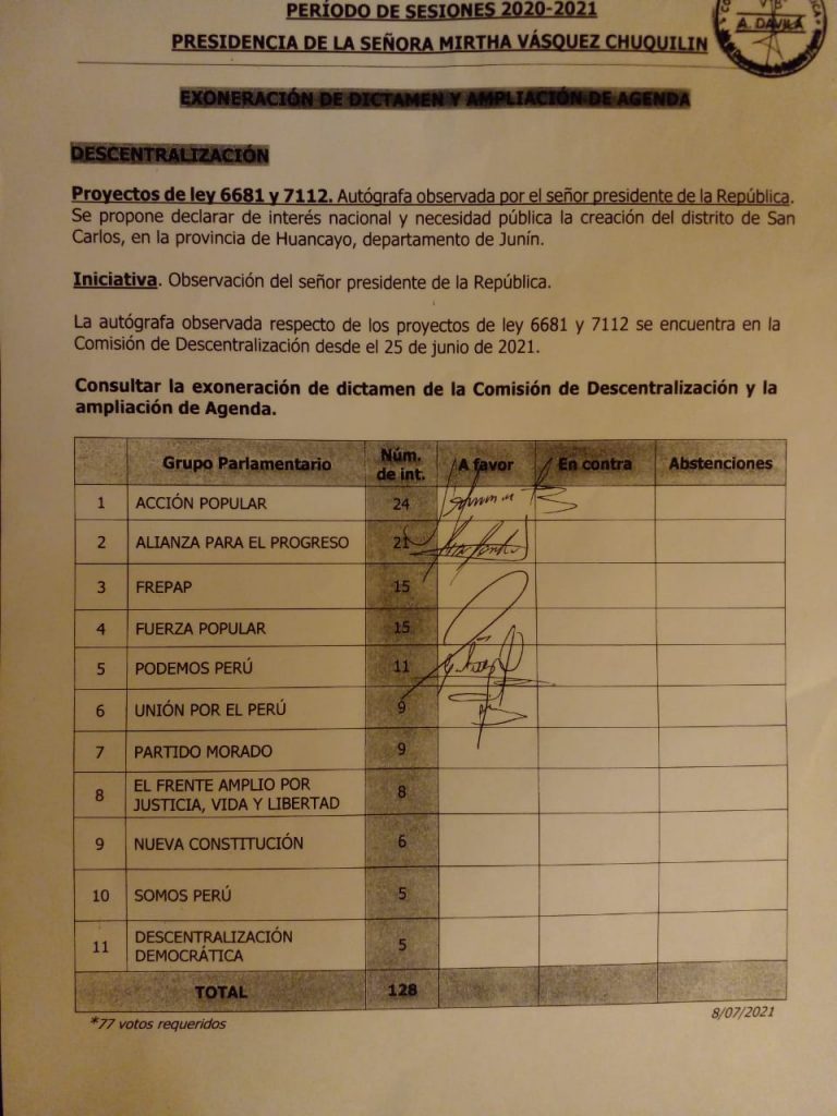El día viernes 9 los voceros de los partidos de Fuerza Popular, Alianza para el Progreso, Acción Popular, Podemos Perú, Unión por el Perú, respaldaron con su firma la exoneración de ir a Comisiones al Proyecto de Ley Nª 6681 y 7112 – 2020 que crea el Distrito de San Carlos.