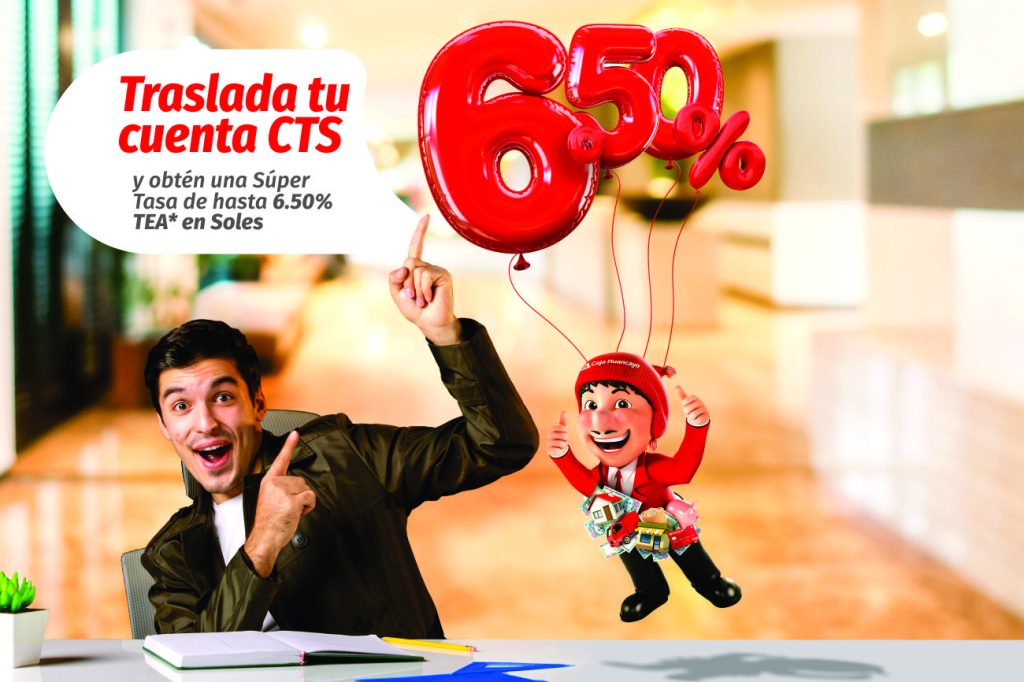 Caja Huancayo proporciona dos opciones para cuentas CTS en moneda nacional, aquella en la que un cliente traslade su cuenta CTS será retribuido con una tasa de interés de hasta 5.50% y la segunda opción, en la que el cliente traslade su cuenta CTS y además perciba sus remuneraciones en Caja Huancayo, recibirá hasta 6.5% de interés anual.