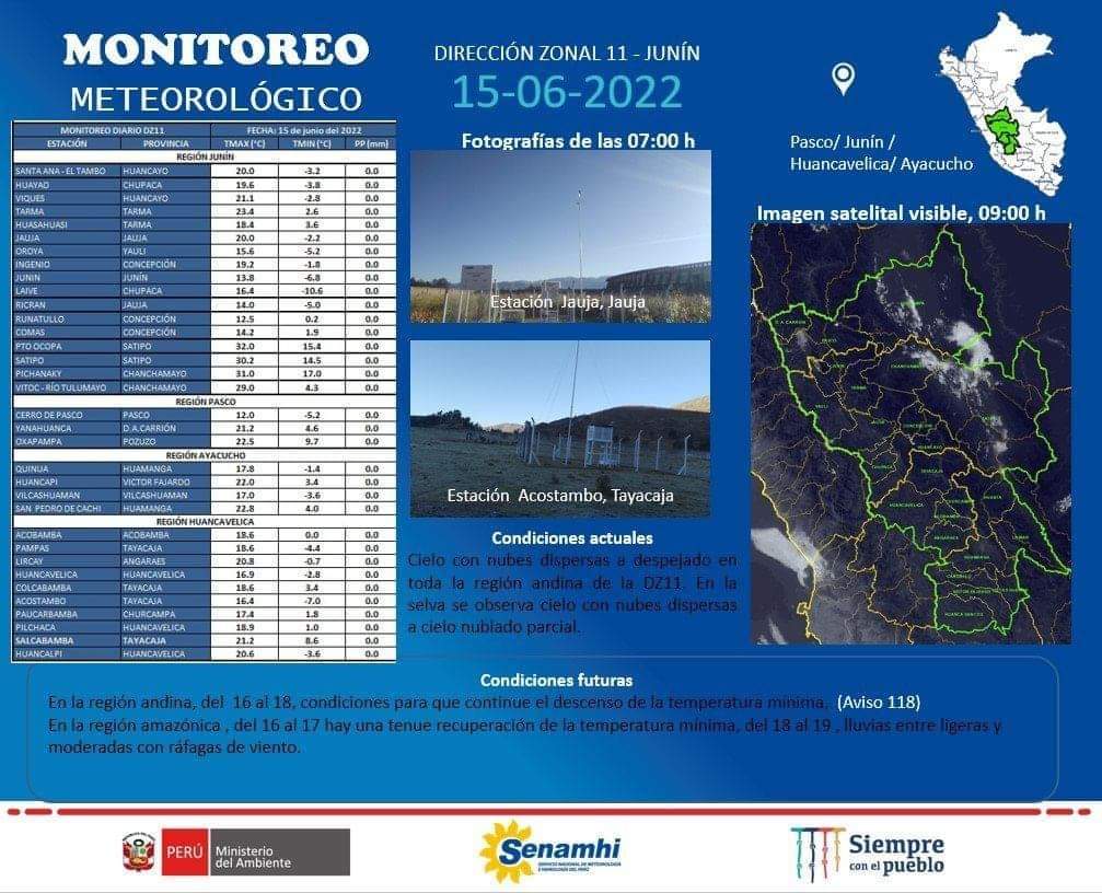 El Servicio Nacional de Meteorología e Hidrología del Perú (SENAMHI) anuncio que desde el 16 y 18 de junio las temperaturas nocturnas de las regiones de la zona centro y sur descenderá hasta en -9°C, dentro de las cuales se encuentra la Región Junín, a tomar sus precauciones.