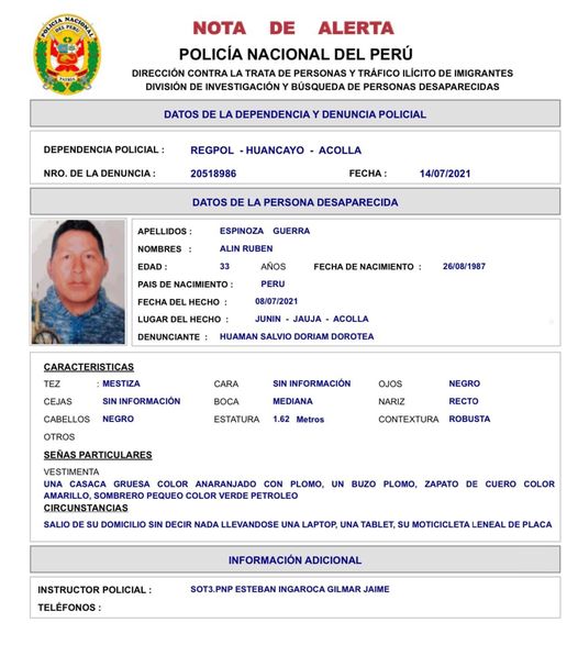 Desde el pasado jueves es buscado intensamente el docente Alin Ruben Espinoza Guerra de 33 años de edad, natural del distrito de Acolla. La denuncia fue presentada por sus familiares ante la Comisaría de Acolla, quienes refieren que el pasado jueves el docente salió de su casa sin decir nada, llevándose una laptop, una tablet y a bordo de su motocicleta lineal. Al momento de su desaparición el docente vestía una casaca gruesa color naranja con plomo, un buzo plomo, zapato de cuero color amarillo, sombrero pequeño color verde petróleo.