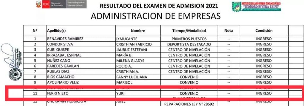Fue exonerado del exámen de admisión gracias a convenio que normalmente favorece a personas de escasos recursos.Actualmente trabaja en la municipalidad distrital de Río Negro donde su esposa es Alcaldesa y ahora es uno de los afortunados ingresantes, la información fue publicada por la propia casa de estudios, el Instituto de Educación Superior Tecnológico Público «Teodoro Rivera Taipe».