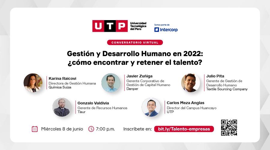 Con la finalidad de conocer estrategias para la atracción y la gestión del talento, la Universidad Tecnológica del Perú (UTP) ofrecerá el conversatorio virtual “Gestión y Desarrollo Humano en 2022: ¿cómo encontrar y retener el talento?”