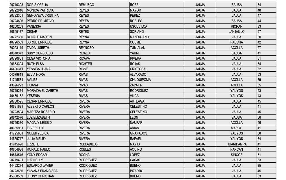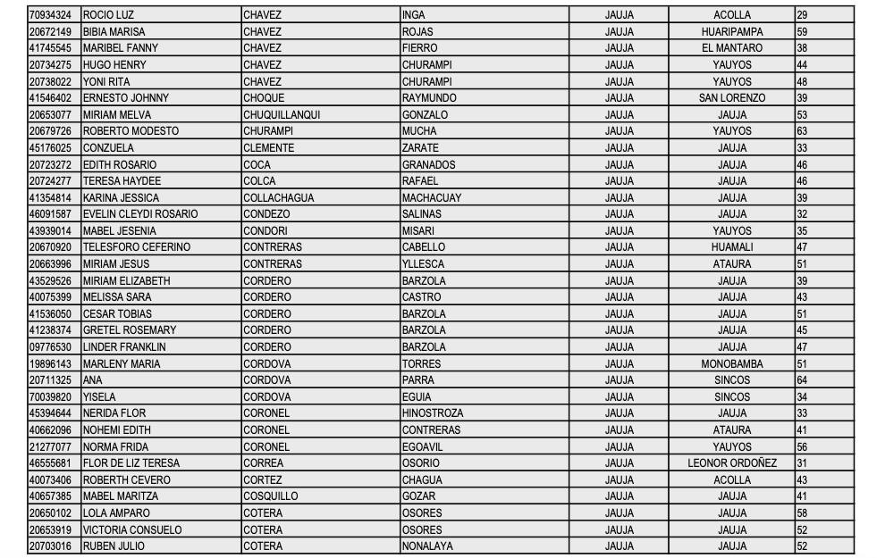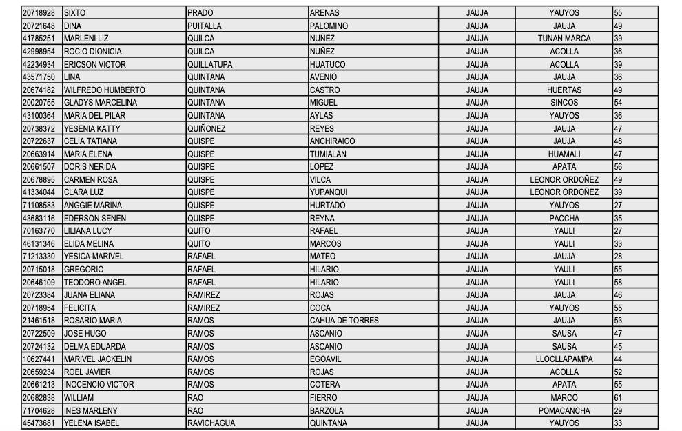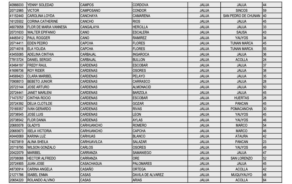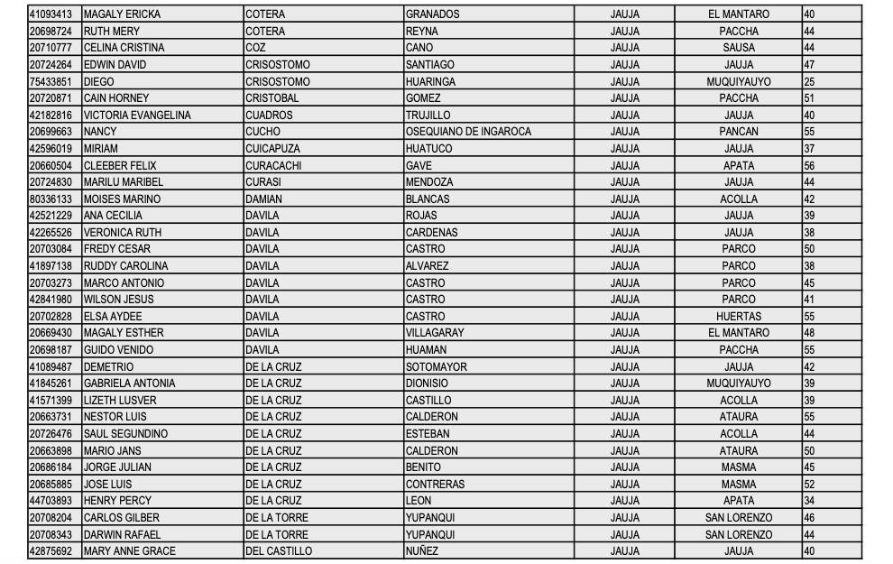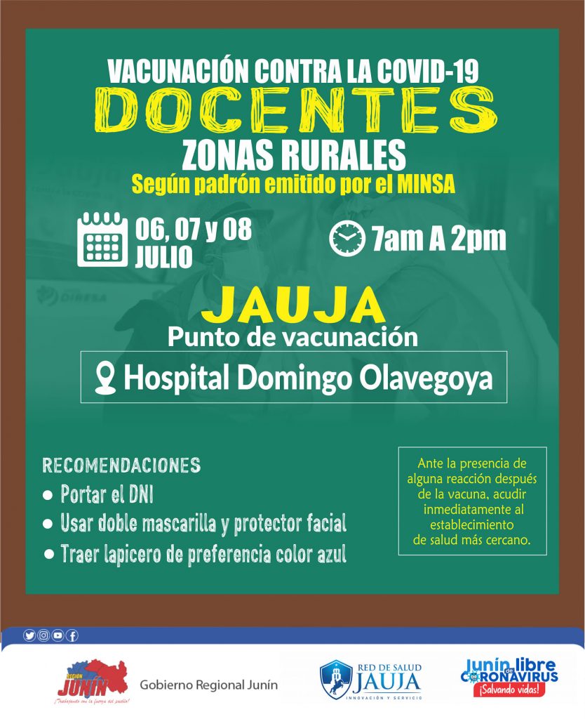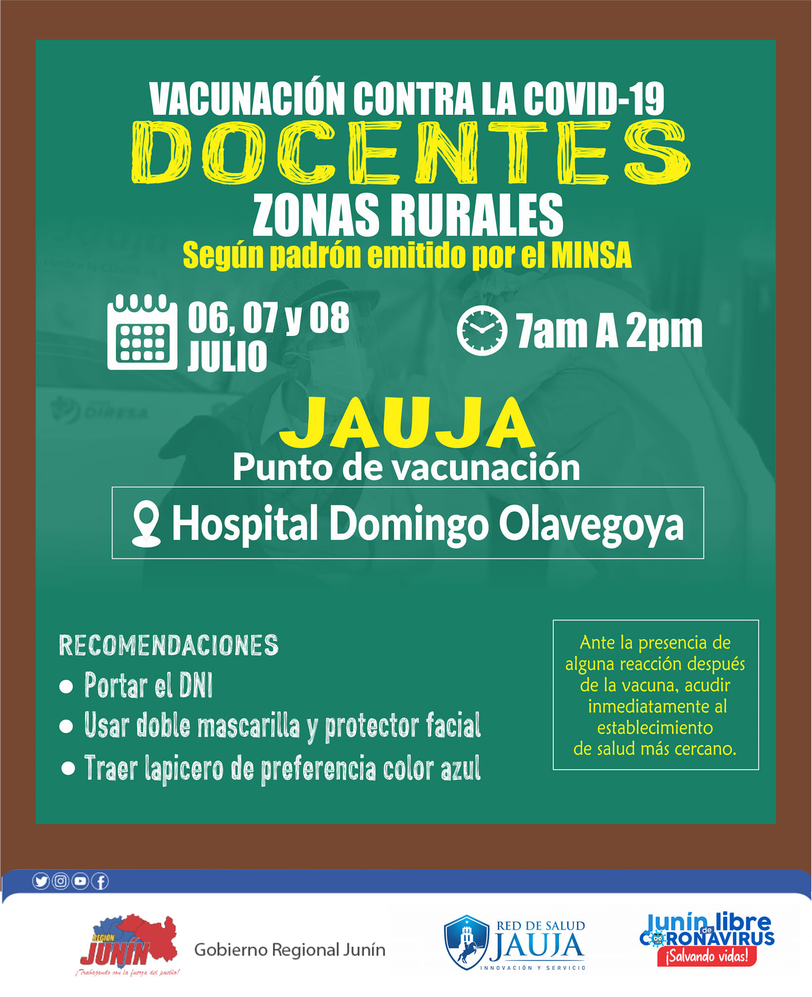 Relación de MAESTROS JAUJINOS que recibirán la primera dosis de la vacuna contra el Covid 19, los días 6,7 y 8 de julio.