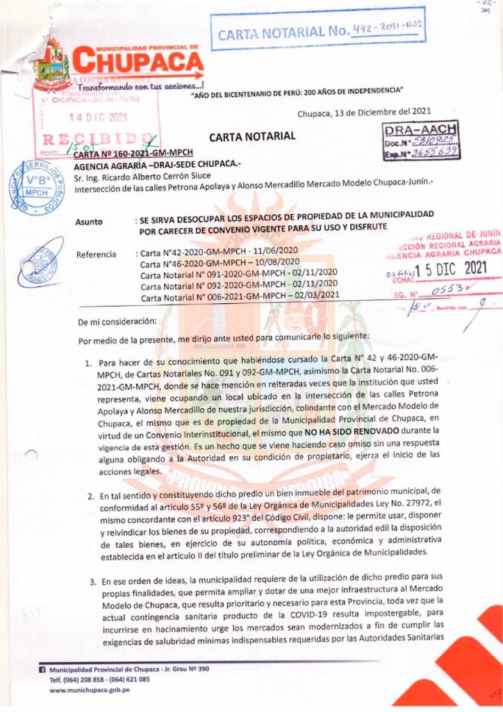 Hasta el momento, la Municipalidad Provincial de Chupaca ha remitido reiteradamente cartas notariales para desalojar el inmueble ubicado en las intersecciones de las calles Petrona Apolaya y Alonso Mercadillo, desde donde la Agencia Agraria Chupaca atiende la población de esta provincia, incluso, a algunas zonas de la provincia de Huancayo y Concepción.