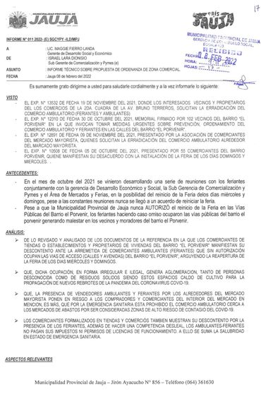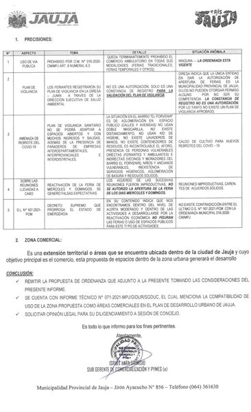 “Pese a que la Municipalidad de Jauja nunca AUTORIZÓ el reinicio de la feria en las vías públicas del barrio El Porvenir, los feriantes haciendo caso omiso ocuparon las vías públicas del barrio generando malestar en los vecinos y moradores del barrio El Porvenir”, cita el informe técnico sobre propuesta de ordenanza de zona comercial. “Que la presencia de vendedores ambulantes y feriantes por los alrededores del mercado Mayorista pone en riesgo a los compradores y comerciantes del interior del mercado en mención, es más, que por la emergencia sanitaria está prohibido el comercio ambulatorio cerca a los mercados de abastos por ser consideradas zonas de alto riesgo de contagio del COVID 19”.