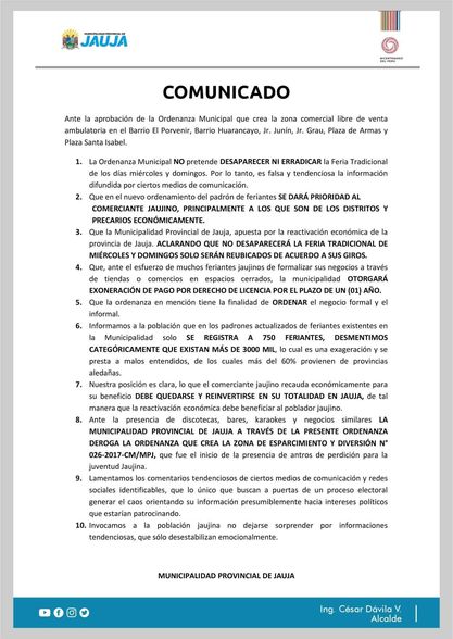 Mientras que, a través de una nota de prensa la Municipalidad de Jauja aclara que siempre apostó por la reactivación económica, sobretodo de los señores feriantes, un documento interno confirma que la gestión edil nunca autorizó el reinicio de la feria y tampoco tiene esas intenciones por considerarlos una molestia y un foco de contagio del COVID 19.