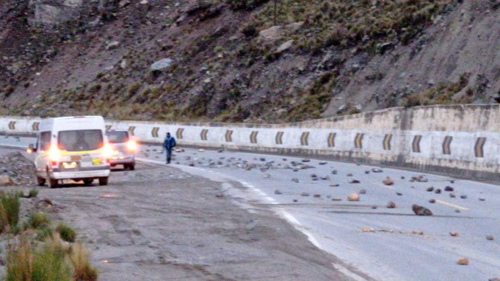 Carretera central totalmente bloqueado, mineros de austria duvas en tres sectores hacen huelga, entre pucará y el sector manuelita morococha la pista esta con varios tramos de piedras y mineros evitando el transito normal.