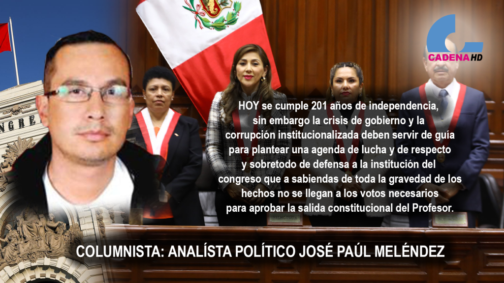 HOY se cumple 201 años de independencia, sin embargo la crisis de gobierno y la corrupción institucionalizada deben servir de guía para plantear una agenda de lucha y de respecto y sobretodo de defensa a la institución del congreso que a sabiendas de toda la gravedad de los hechos no se llegan a los votos necesarios para aprobar la salida constitucional del Profesor.