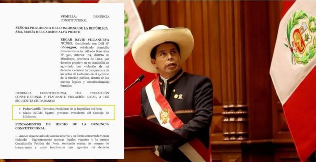 Denuncia constitucional tramitada por el exlegislador Edgar Villanueva contra el presidente Pedro Castillo por presunta «falta de transparencia e incumplimiento de la Ley de gestión de intereses en la administración pública».Así mismo Villanueva solicita que se declare nulo el nombramiento del gabinete porque no se realizó en el Palacio de Gobierno.
