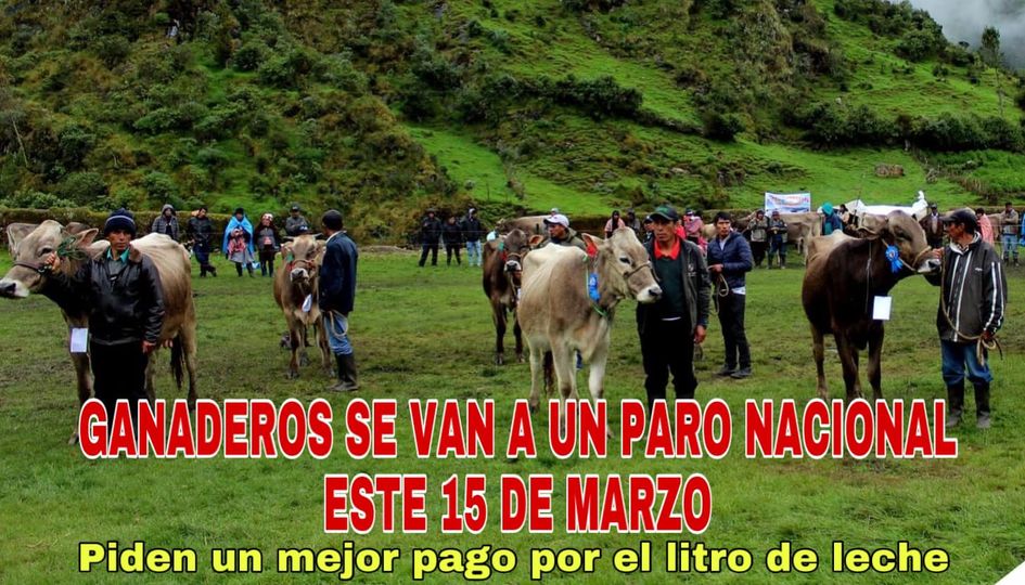 El presidente de la Asociación de ganaderos de la Macro región Junín, Carlos Paredes Montes, confirmó la participación de más de 5 mil ganaderos y productores lecheros en el paro convocado para este martes 15 de marzo. Esta jornada de protesta podría ocasionar el bloqueo de carreteras desde tempranas horas en el Valle del Mantaro, para exigir un mejor pago por el litro de leche. Durante la protesta también exigirán la modificación del reglamento de la leche. “Pedimos que las empresas cumplan las normas internacionales, que exige, que la leche enlatada sea un producto transformado de la leche fresca y fluida”.Dentro del pliego de reclamos también se exige una reestructuración de Agrobanco.
