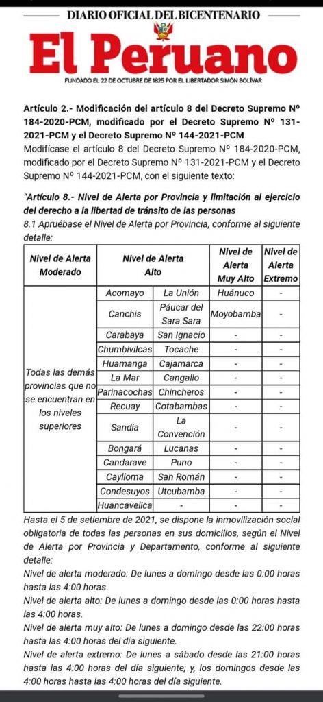 El Poder Ejecutivo prorroga por novena vez el Estado de Emergencia Nacional, declarado mediante D.S. N° 184-2020-PCM, por el plazo de 30 días calendario contados a partir del miércoles 1 de setiembre de 2021.