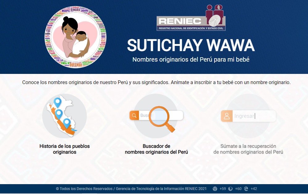 El Registro Nacional de Identificación y Estado Civil (RENIEC), implementó desde este mes, el nuevo aplicativo web “SUTICHAY WAWA, Nombres del Perú para mi bebé”, para que padres de familia, al momento de inscribir el nacimiento de sus hijos recién nacidos, tengan alternativas de elegir nombres originarios de pobladores nativos de nuestro país.