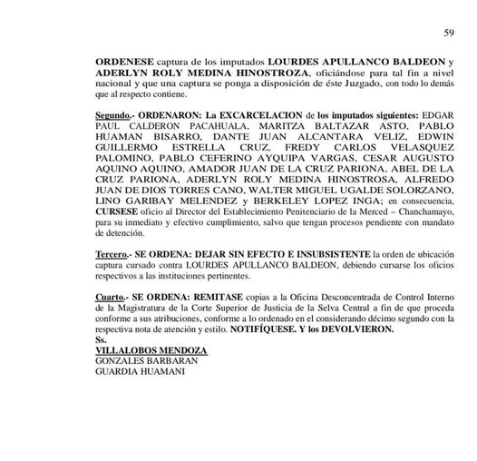 En consecuencia, CURSESE oficio al Director del Establecimiento Penitenciario de la Merced – Chanchamayo, para su inmediato y efectivo cumplimiento, salvo que tengan procesos pendiente con mandato de detención. Tercero.- SE ORDENA: DEJAR SIN EFECTO E INSUBSISTENTE la orden de ubicación captura cursado contra LOURDES APULLANCO BALDEON.